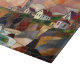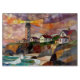 Beautiful cutting board featuring a charming coastal village with a lighthouse overlooking the ocean at sunset. The artistic stained glass style adds warmth and elegance to any kitchen.