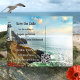Save the Date postcard featuring a painting of a coast with a lighthouse in vibrant colors. Beautiful for a destination wedding or a wedding with a nautical theme.