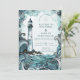 This coastal wedding design features a hand-illustrated lighthouse rising above dramatic ocean waves, framed by flowing watercolor textures in soft teal, seafoam, and deep blue tones. The composition blends nautical romance with an elegant, storybook feel, creating a striking yet refined seaside aesthetic.