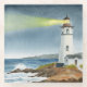 A serene watercolor painting of a majestic white lighthouse standing on a rocky shore. This atmospheric coastal illustration brings a sense of peace and nautical charm, perfect for lovers of the sea and maritime adventures.
