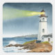 A serene watercolor painting of a majestic white lighthouse standing on a rocky shore. This atmospheric coastal illustration brings a sense of peace and nautical charm, perfect for lovers of the sea and maritime adventures.