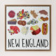 Print features an original illustration of an assortment of classic New England foods, including cranberries, blueberry pie, lobster, a seafood clambake, cider donuts, clam chowder, clams, maple candy, boiled dinner, Boston baked beans, clamcakes, and a lobster roll. All of the best foods of Maine, Massachusetts, Rhode Island, Vermont, and New Hampshire.