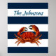 Red crab over nautical blue stripes; perfect for nautical or coastal looks.