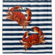 Red crab over nautical blue stripes; perfect for nautical or coastal looks.