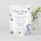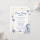 Celebrate "One Day Away" with this stunning Coastal Rehearsal Dinner Invitation. This design perfectly captures the essence of a Coastal Wedding or a luxury maritime event. It features a sophisticated navy blue and faux gold glitter palette with elegant watercolor illustrations of starfish, sea coral, and a graceful jellyfish. The intricate gold botanical frame highlights the details of your beach, yacht club, or seaside rehearsal dinner. The formal script font announces the honored couple. This template is ideal for couples planning an upscale summer or destination wedding.