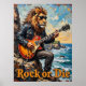 This vibrant artwork features a cool lion, sporting sunglasses and a leather jacket, intensely playing an electric guitar atop a rock overlooking a dynamic, wave-filled ocean. A fiery sunset illuminates the sky and distant coastline. The painting's thick, textured brushstrokes give a raw, energetic feel to the scene, with "Rock or Die" boldly displayed below, embodying a rebellious spirit.