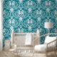 This coastal seahorse damask design on peel and stick wallpaper features seahorses, seaweed, coral and shells in teal blue and white colours to add an underwater ocean vibe to your home decor.