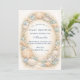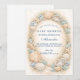 A soft coastal design featuring an elegant oval wreath composed of seashells, oysters, starfish, sea glass, and delicate dune grasses. Neutral sandy tones blend beautifully with muted blue accents, creating a refined seaside aesthetic that feels airy and sophisticated. The warm ivory background enhances the natural textures while keeping the layout clean and graceful. Perfect for a beach-inspired celebration with timeless, understated charm.