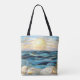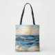 This elegant tote bag showcases a serene ocean sunset inspired by stained glass art, featuring layered blue waves and a softly glowing golden sun. The refined coastal design evokes calm, warmth, and timeless seaside beauty.