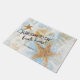 This Welcome Doormat has a beautiful coastal starfish print with one large and small realistic starfish and several others overprinted in white on light blue background and Welcome in a script font. Look for other products in this Coastal Starfish Collection. Text reads: Welcome To Our Beach House. Customising your family name is easy to do. Design by Jenn's Emporium.