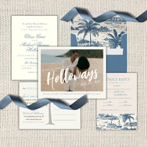 Make your wedding planning effortless and elegant with this textured RSVP card insert, featuring a stunning dusty blue coastal hand-painted pattern. This design showcases delicate details of palm trees, sailboats, and seaside cottages, perfect for setting the tone of your beach wedding or coastal-inspired celebration.