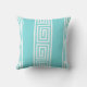 Bold bright colour turquoise and white greek key pattern outdoor pillows. the modern chinoiserie chic pillows add a burst of colour to your patio decor, enliven your outdoor chairs with modern chic. great for summer coastal living.