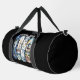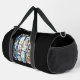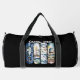 This black duffle bag features four vibrant vertical panels with watercolor-style coastal elements: a fish on an anchor, a sailboat on the water, a seashell with small fish, and a lighthouse with a dolphin, all under the text "COASTAL VIBES." Edit colour of the bag caps and body in the Design tool to your favored colours.