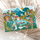 Beautiful illustrated greeting card featuring a colorful coastal village with sailboats, a lighthouse, birds flying over the harbor, and rolling hills in the background. This charming seaside landscape artwork is perfect for sending warm wishes, travel-inspired notes, or thoughtful greetings to someone special. Original artwork by Caroline Bonne Müller