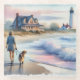 This dreamy coastal artwork captures a tranquil moment at the shoreline, where a woman strolls barefoot with her dog, the soft pastel tones of the setting sun casting a warm glow on the sand and sea. A charming beach house sits nestled among windswept grasses, its porch inviting and timeless, while a stately lighthouse watches over the horizon. Gentle waves roll in with watercolor softness, and hints of blush pink, misty blue, and sun-kissed gold give the scene an ethereal, nostalgic quality. The entire composition evokes slow living, serenity, and the quiet magic of coastal escapes. With a relaxed, coastal cottagecore vibe and a soft, painterly style, this piece blends warmth and whimsy in perfect harmony. AI generated artwork.