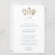 Share your wedding reception menu details in elegant style with these coastal wedding menus in white with navy lettering and a trio of aqua and ivory watercolor oyster shell illustrations. Add your initials and wedding date to the top, then customise the menu items arranged by course.