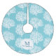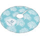 Nautical style Christmas tree skirt featuring a white sea coral pattern over bright cyan blue. It also features a white monogram circle with your family's monogram letter and full name in script.