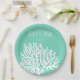 Coastal white coral themed paper plates with a sea glass green background colour perfect for a summer beach wedding!