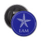 This cute monogrammed round bottle opener features a white starfish on a background of classic navy blue. Personalise the monogram with your choice of initials. Makes great monogrammed party favours!