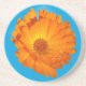Calendula. A Single flower head with dew drops on the orange petals , blue background.