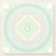 Squares in colours of the rainbow (orange, yellow, red, purple, blue) are stepped up in size from the centre and twisted 90 degrees to look interwoven. A dark green circle encircles all of the squares and holds them down on the bright green background. Personalise the central initial which is also dark green, with a yellow drop-shadow.