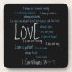 This attractive coaster set features lines from 1 Corinthians 13:4 "Love is patient, Love is kind..." randomly placed across the coaster