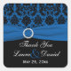 This 1.5" cobalt blue and black damask wedding favour thank you sticker or envelope seal has a blue FAUX ribbon and jewel brooch that matches the wedding invitation shown below. You can change the text to say whatever you want, and you can also change the sticker size and/or shape. If you require any other matching items in this design, please email your request to niteowlstudio@gmail.com.