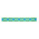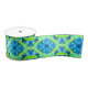 Ribbon in a digital tie dye pattern in shades of cobalt blue, turquoise, and lime green, accented with white