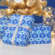 Wrapping paper in a batik effect, tilled pattern, with abstract floral elements, in shades of denim, cobalt and sky