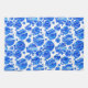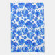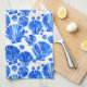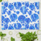 Kitchen towel in a pattern of dark and medium cobalt blue and light blue semi-abstract sea shells on a white background