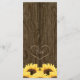 A SUNFLOWER MENU CARD WITH COUNTRY CHARM AND A RUSTIC FEEL WITH A WOOD GRAIN WOODEN FENCE OR BARREL LOOK DESIGN AND A NAIL HEAD TRIM. A COBALT BLUE NAVY BANNER ON THE FRONT AND A CARVED HEART LOOK DESIGN ON BACK WHERE THE INITIALS OF THE BRIDE AND GROOM CAB BE ADDED. A BOUQUET OF GOLDEN YELLOW SUNFLOWERS HAVE A VINTAGE AND PAINTERLY LOOK. PERFECT FOR A WEDDING ANNIVERSARY OR ENGAGEMENT PARTY WITH A BARN OR FARMHOUSE THEME. DESIGN © CHRISSY H. STUDIOS, LLC. ALL RIGHTS RESERVED.