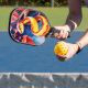 Cobra with vibrant red and yellow scales in tree pickleball paddle