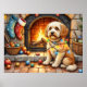 Cockapoo Sitting by Fireplace with Christmas Light Poster