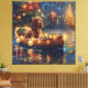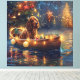 Set sail into the magic of the holiday season with this beautifully detailed illustration, showcasing a proud dog sitting in a festively decorated boat, gliding across a serene Christmas lake. The twinkling lights from nearby pine trees reflect off the water, casting a warm, festive glow that enhances the cosy ambiance. Ornaments dangle from the boat's sides, while glowing lanterns light the way, creating a scene that captures the true essence of Christmas warmth and joy. This nostalgic artwork brings a touch of holiday magic to any space, perfect for those who cherish the spirit of the season.