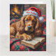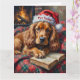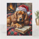 This luxurious watercolor captures the gentle beauty of the Cocker Spaniel, seen wearing a delicate Santa hat while snuggled cozily on a plaid blanket, resting by the fire with a classic Christmas storybook. A warm and beautiful design for Cocker Spaniel enthusiasts.