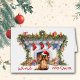 The front of this Christmas greeting card has an image of an English Cocker Spaniel dog wearing a red and white Santa hat. The dog sits in front of a decorated fireplace, expectantly waiting for Santa Claus. The red text at the bottom says "Waiting for Santa". The text is customisable, as is all the inside text, so you may make it say whatever you'd like. Cute! See more spaniel images, along with dozens of other dog breed products, at Dog Village.