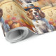 A watercolor-style painting of a cheerful dog sitting amidst a pile of vibrant fall leaves, surrounded by tiny pumpkins and scattered acorns. The dog wears a little pilgrim hat and beams with joy, capturing the spirit of Thanksgiving. In the background, soft harvest fields and golden-hued trees create a peaceful countryside ambiance. Gentle textures and warm, muted autumn tones give the scene a cosy, nostalgic feel perfect for celebrating the beauty of the season.