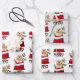 The repeated pattern on these Christmas wrapping paper sheets is an image of an adorable Cocker Spaniel Puppy dog peeking out from a red and white Holiday gift bag. Behind him is a sprig of holly and red berries. Stylised red and black buffalo plaid text says MERRY CHRISTMAS". The background on two of the sheets in this set is white, while the third sheet is silver.