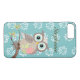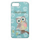 The owl in shades of light chocolate brown and its body has a pink rose with lime green leaves and white circular pattern. The wings are in chocolate brown with white pattern. The leaves on a branch are in dark orange, teal, lime. The background is in light teal with white berries pattern. The text is in chocolate brown as well and it's customisable. This is a digital illustration.