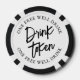 These custom poker chips feature your logo in the centre of the front, with customisable text fields above and below for names, dates, or event details. The back reads “One Free Well Drink” at the top and bottom, with “Drink Token” prominently in the centre.