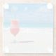 Strawberry daiquiri cocktail on white sandy beach with bright blue sea in the background on glass coaster.