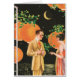 Vintage illustration of a couple conversing on the terrace in the moonlight. Tree branches with green leaves, the calm water of the ocean glittering in the moonlight and large orange party lights are seem behind them.