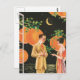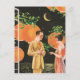 Vintage illustration of a couple conversing on the terrace in the moonlight. Tree branches with green leaves, the calm water of the ocean glittering in the moonlight and large orange party lights are seem behind them.