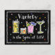 These cute and colourful recipe cards are sure to delight. Featuring 4 different drinks, including lemonade, a martini and olive and a fruity drink complete with umbrella. Text says VARIETY IS THE SPICE OF LIFE. Lined back with PERSONALIZATION for your favourite gourmet chef or bartender. Make a gift set with our coordinated kitchen magnet or note cards.