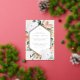 Elegant floral baptism invitation features an elongated hexagonal frame of watercolor flowers and foliage in boho desert inspired shades of peach, white, ivory, and sage green, and finished with rose gold foil trim on a warm ivory background. Personalise with your church baptism ceremony and party details in classic serif lettering.