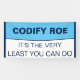 Codify Roe It's the Very Least You Can Do.Codifying Roe should be the floor of women's healthcare rights, not the ceiling. And now, even that doesn't exist. Tell Congress it's time that they do the very least they can do for women's health, safety, and equality, because women are people, and abortion, whatever the reason, is healthcare. Design description: The design space is a white background with a dark blue border. In the top half of the design space, the words, "Codify Roe" in a dark blue sans serif font. Underneath that, a wide light blue stripe with matching dark blue top and bottom borders. Below the stripe, in the bottom half of the design, the words, "It's the very least you can do" across two lines.