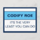 Codify Roe It's the Very Least You Can Do.Codifying Roe should be the floor of women's healthcare rights, not the ceiling. And now, even that doesn't exist. Tell Congress it's time that they do the very least they can do for women's health, safety, and equality, because women are people, and abortion, whatever the reason, is healthcare. Design description: The design space is a white background with a dark blue border. In the top half of the design space, the words, "Codify Roe" in a dark blue sans serif font. Underneath that, a wide light blue stripe with matching dark blue top and bottom borders. Below the stripe, in the bottom half of the design, the words, "It's the very least you can do" across two lines.