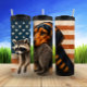 A loyal hound dog, possibly a Black and Tan Coonhound, affectionately embraces a racoon, presenting an unusual yet heartwarming scene of interspecies companionship. Behind them, a rustic American flag serves as a patriotic backdrop, suggesting a theme of rural life and unexpected friendships. The artwork's style emphasizes the animals' gentle expressions.
