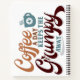 A funny and sarcastic retro-style graphic showcases a steaming cup of coffee bursting with energy. The vibrant text reads, "Coffee a day keeps the grumpy away." This playful design is featured on a variety of products, making it a perfect gift for coffee enthusiasts.