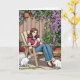 Just a sweet card for a friend with a little cat humour. A fun comic book illustration of a woman sitting on her lawn chair on her patio, with her cat, a cup of coffee or tea and surrounded by purple clematis and hanging plants.